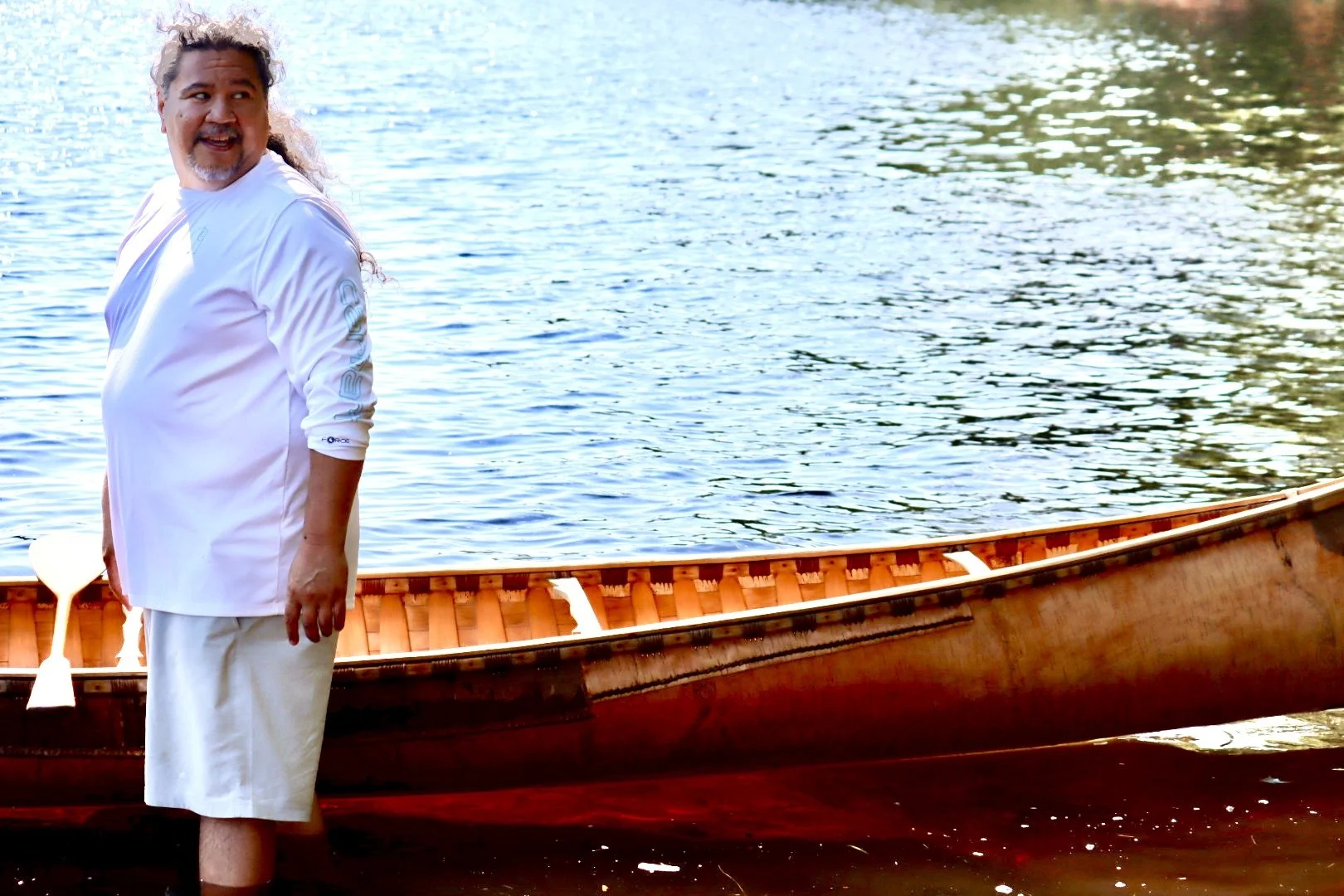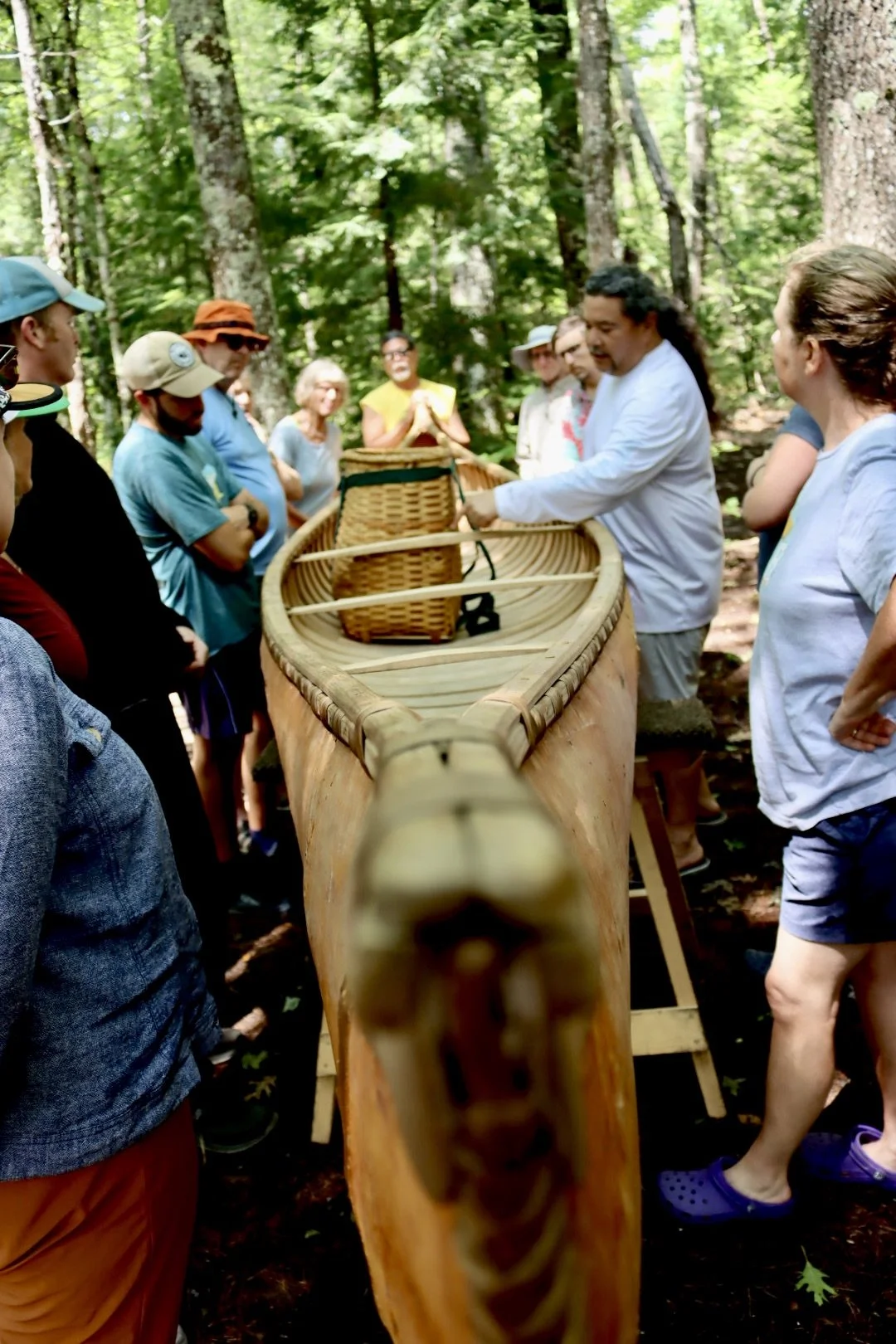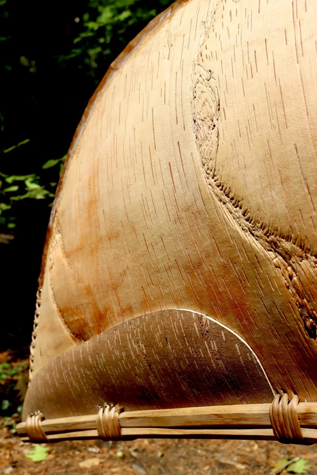 Jason Pardilla is a birch bark canoe maker. His pride and passion for carrying this tradition forward was palpable. A very specific white birch tree is needed to create this craft and they are more and more rare and challenging to find.The bark needs to be a very specific thickness, length and width, free of branches, from the bottom of the trunk up about 26 feet to work best. It can take weeks to find such a tree. Extracting it takes precision, skill and patience. All of this is done with great reverence and appreciation.