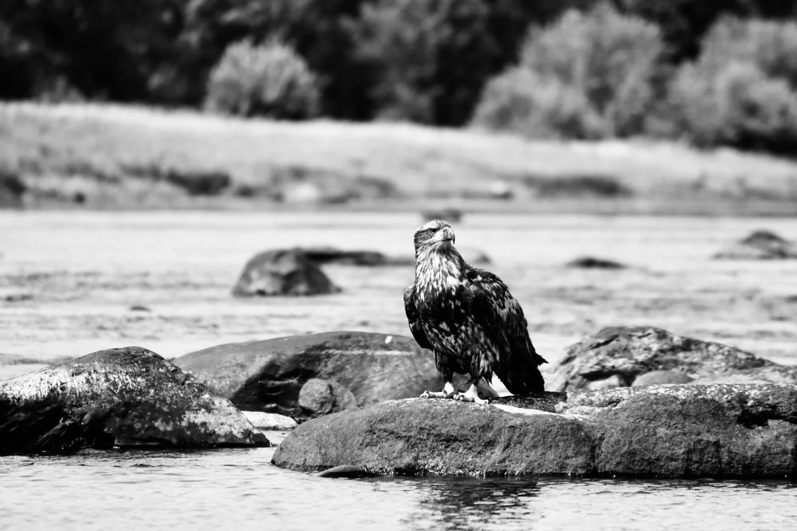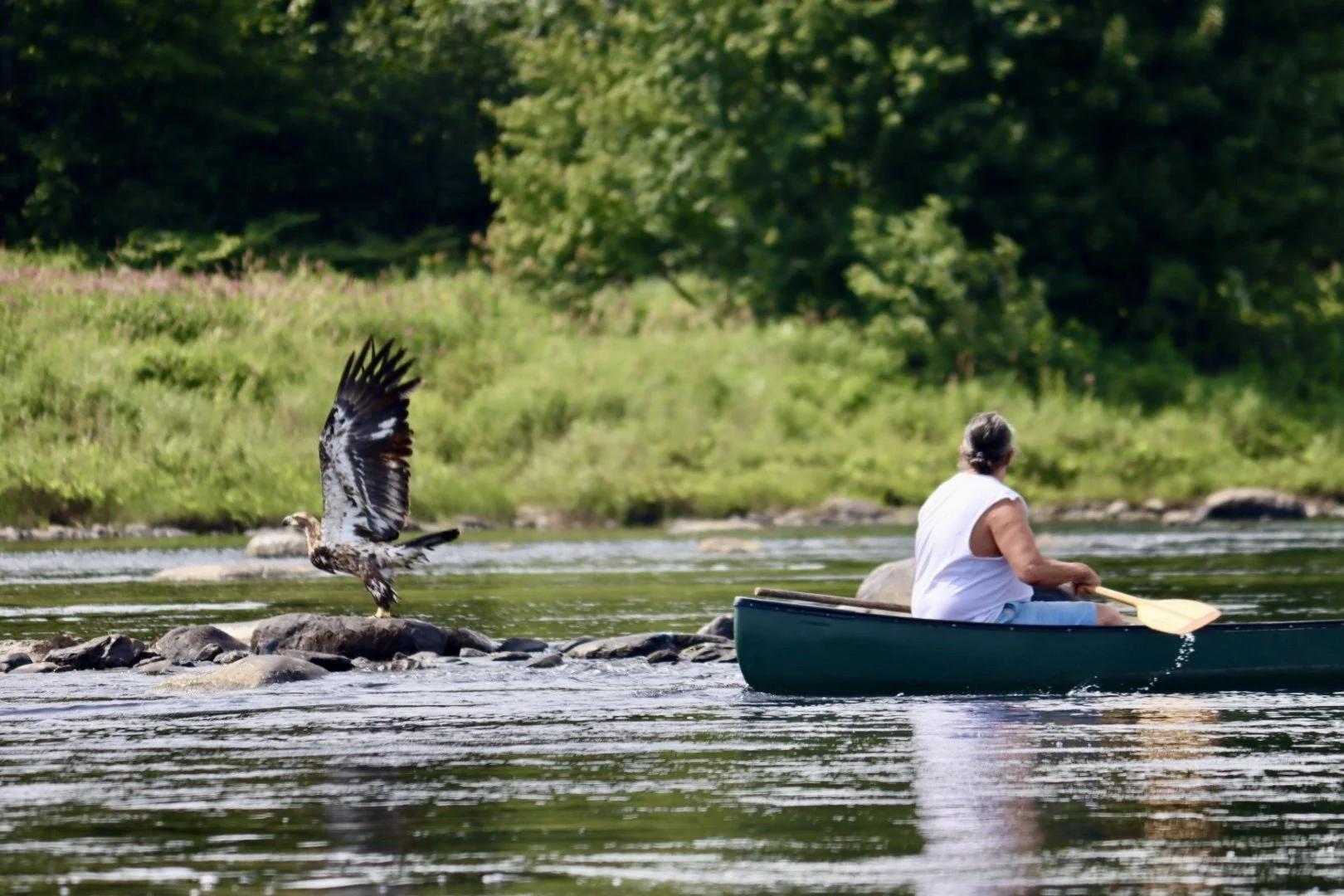 Penobscot guide Ryan Mitchell gets up close and personal with this immature bald eagle.